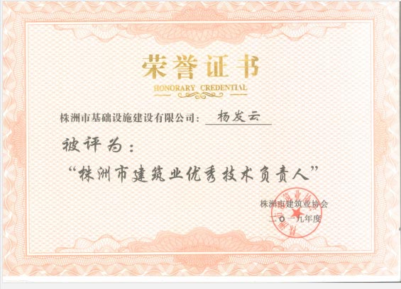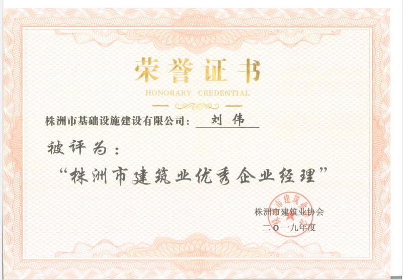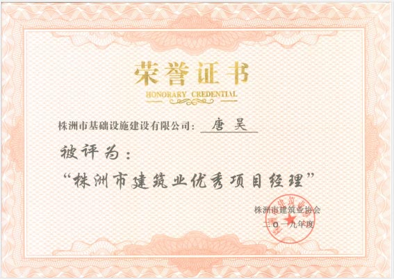 熱烈祝賀我公司在2019年度株洲市建筑業(yè)協(xié)會評選中獲得株洲市建筑業(yè)優(yōu)秀企業(yè)稱號;我公司劉偉獲得株洲市建筑業(yè)優(yōu)秀企業(yè)經(jīng)理稱號;楊發(fā)云獲得株洲市建筑業(yè)優(yōu)秀技術(shù)負(fù)責(zé)人稱號;唐昊獲得株洲市建筑業(yè)優(yōu)秀項目經(jīng)理稱號。
